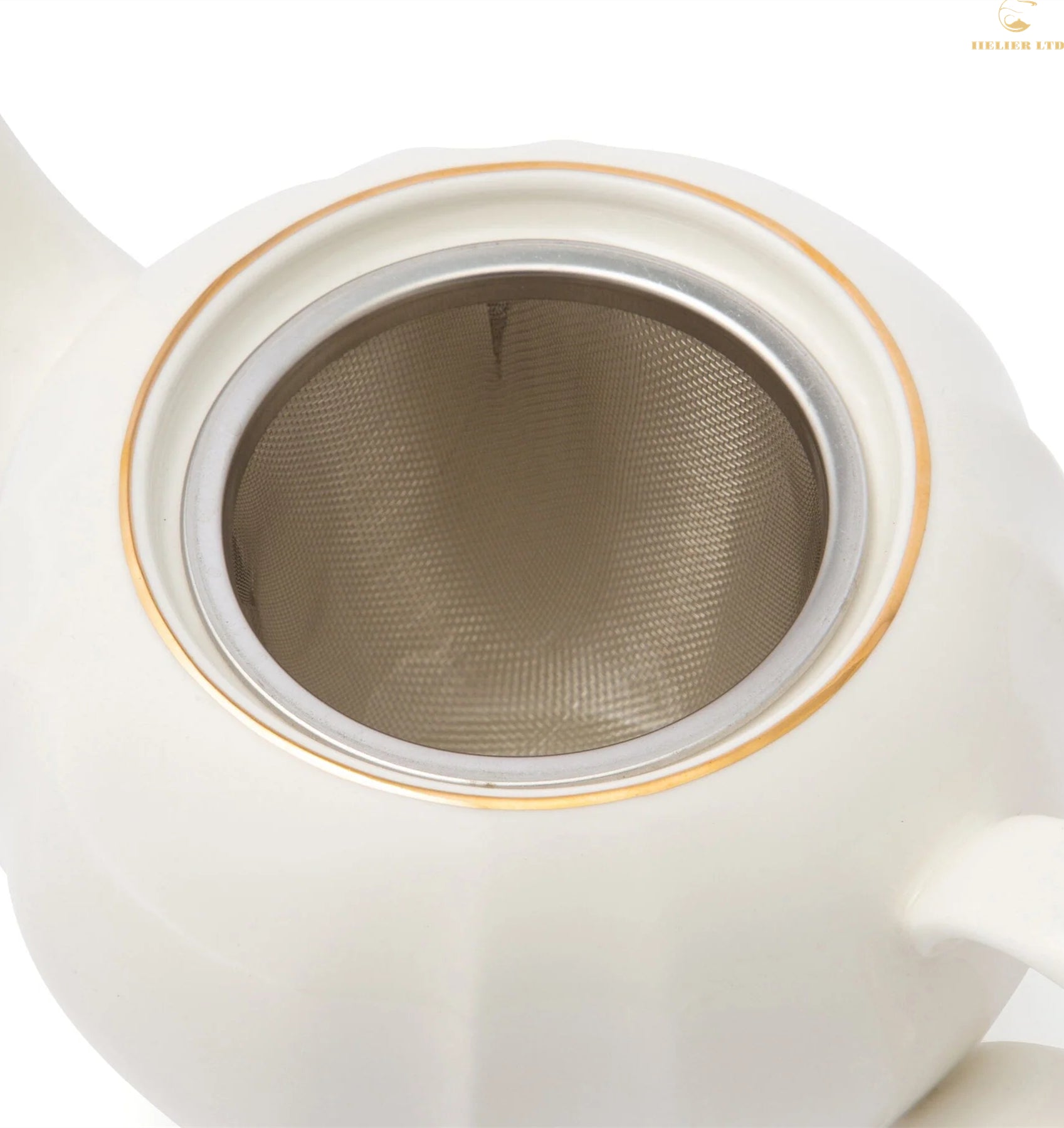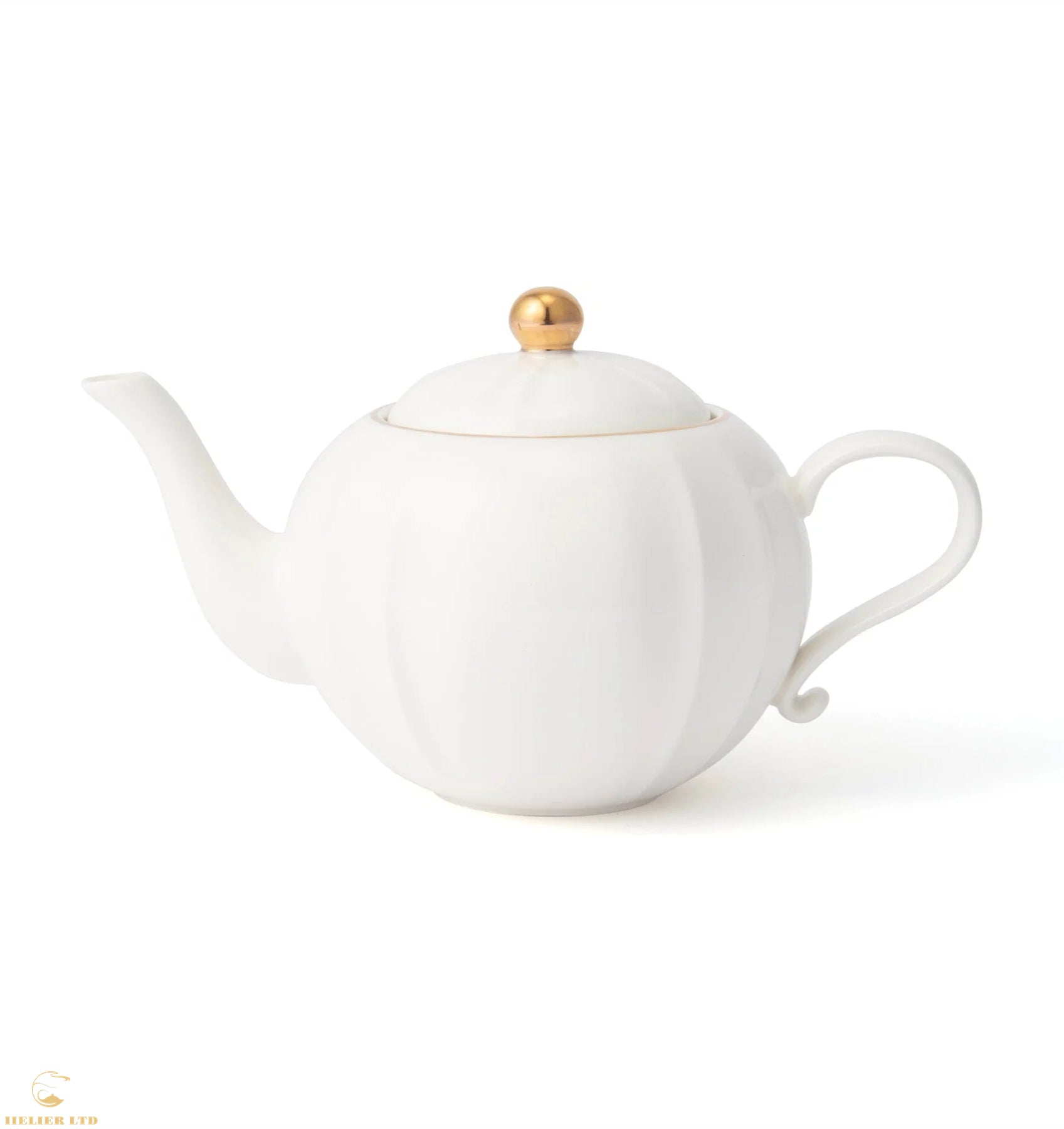 This teapot features a delicate floral design. Its rounded body and gold handle create a charming, flowing silhouette, embodying elegance.